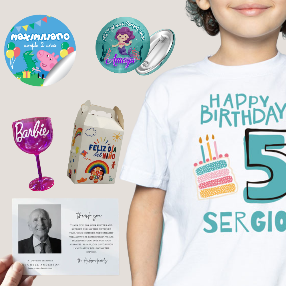 Todo lo que necesitas para sorprender en tus momentos especiales: poleras, globos, recuerdos y más para cumpleaños y celebraciones. Además, imprimimos tarjetas de condolencias personalizadas para expresar tu cariño de forma única.