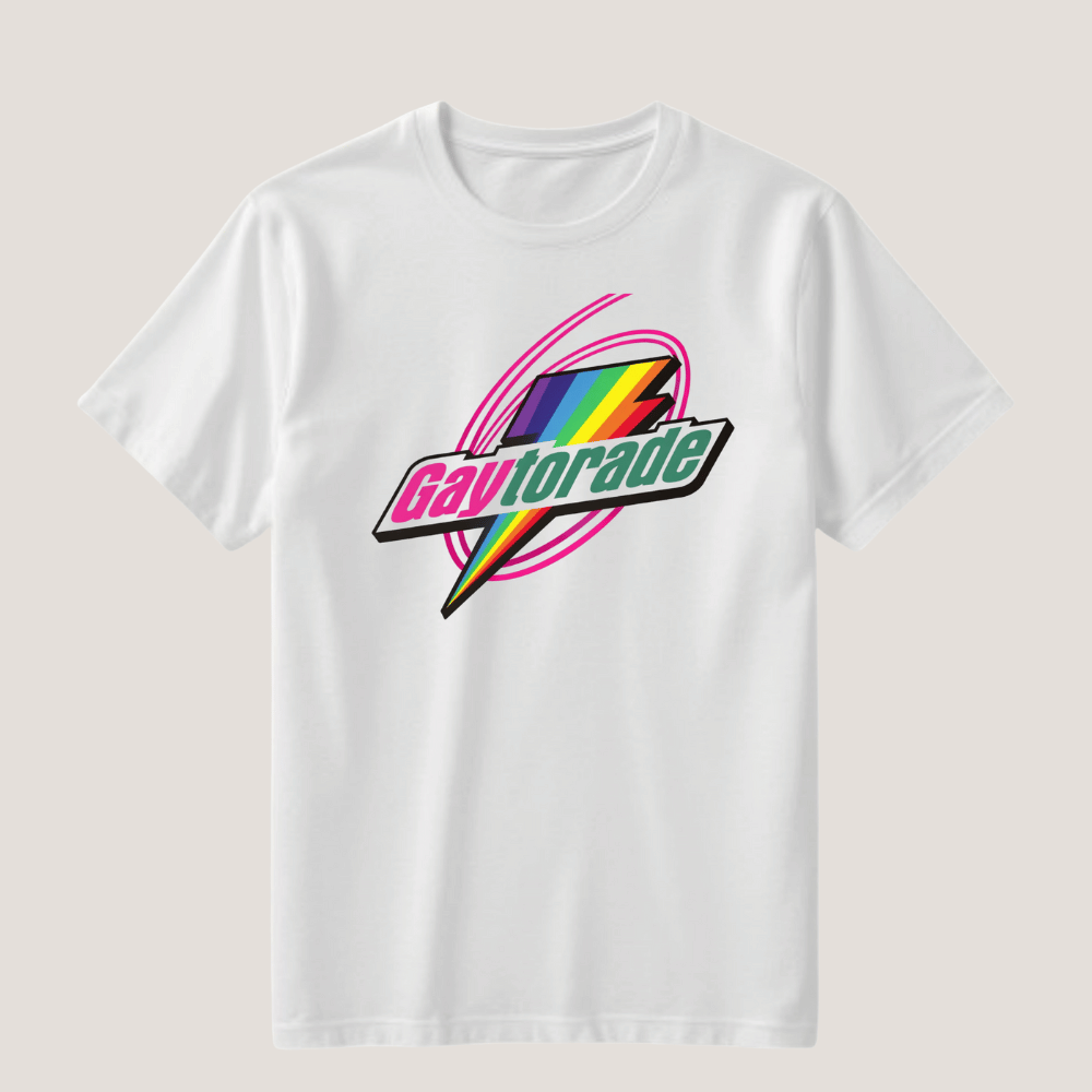 Polera parodia gráfica tipo marca deportiva con estética arcoíris. Humor visual moderno, meme contemporáneo y alto impacto.