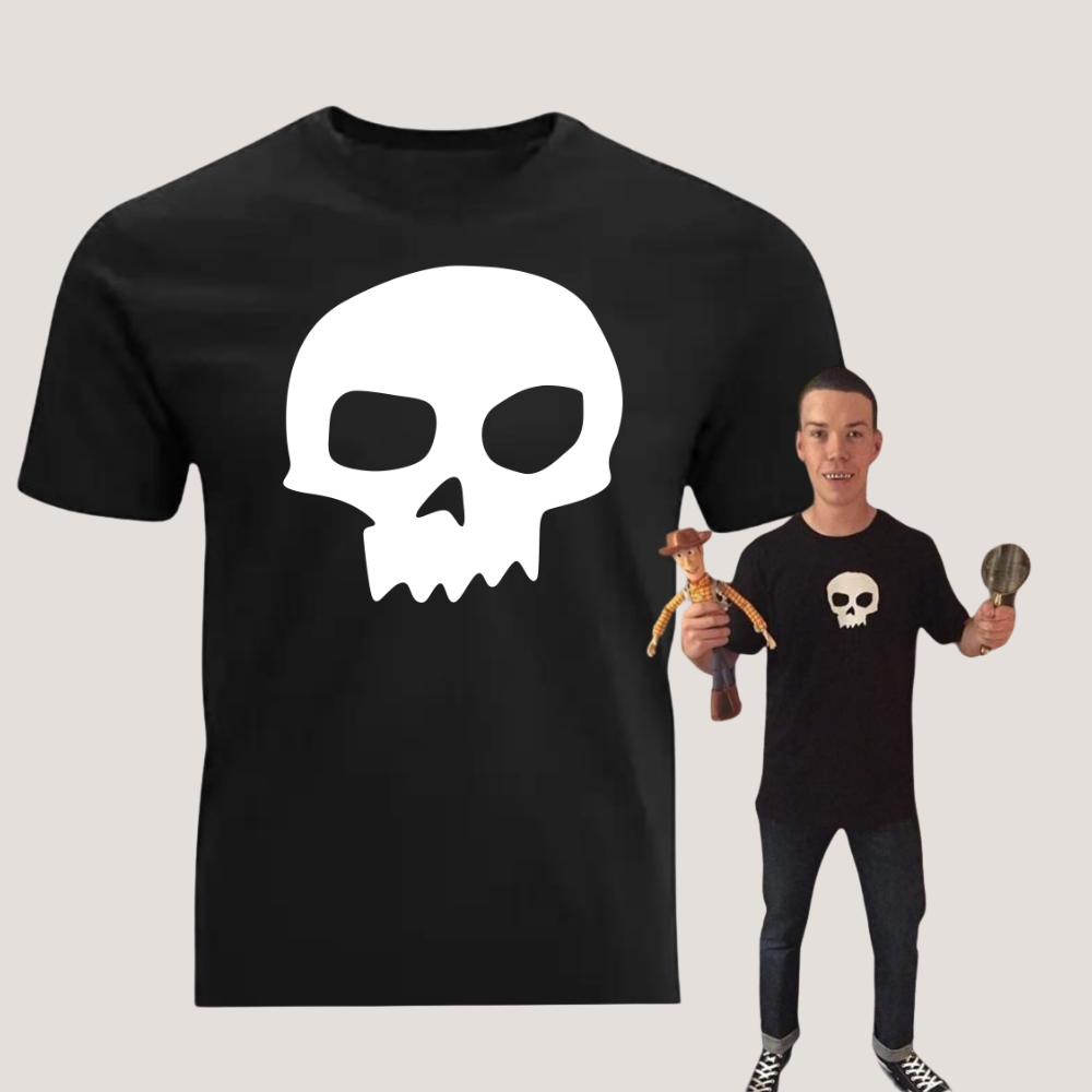 Dale un toque rebelde y nostálgico a tu estilo con nuestra polera negra con calavera inspirada en Sid de Toy Story.