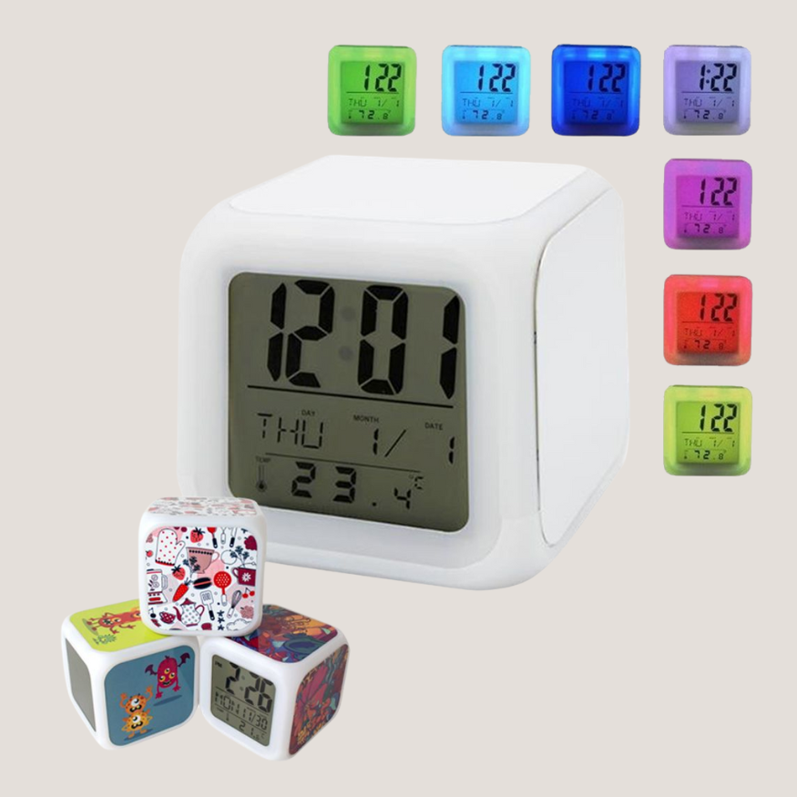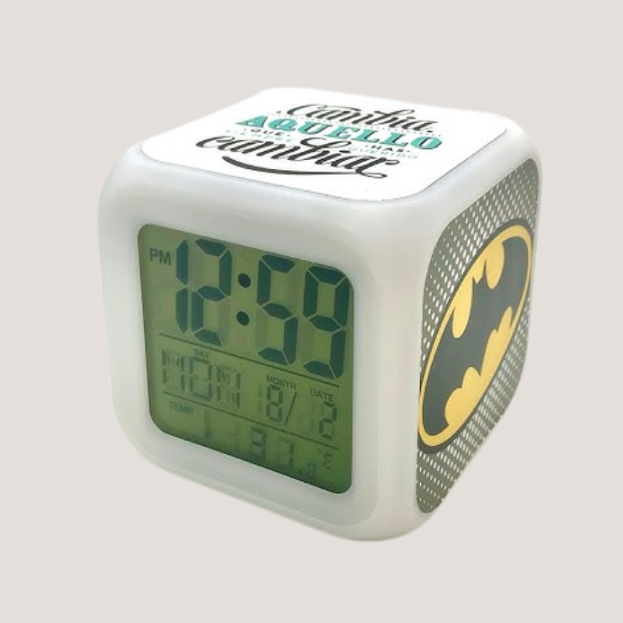 Este hermoso reloj digital sublimable destacará donde sea que lo coloques ya que brilla en sus increíbles 7 cambios de color, destacando de gran manera con las luces apagadas. Puedes utilizarlo como reloj o alarma, incluye cinta adhesiva de doble cara + 3 placas sublimables.