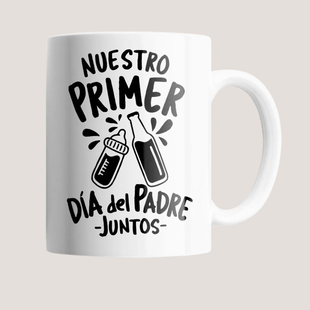 Esta taza “Nuestro Primer Día del Padre Juntos” es el regalo perfecto para conmemorar esa etapa única entre papá y su bebé. El diseño minimalista en blanco y negro combina un mamadera y una botella brindando, simbolizando la nueva aventura compartida.