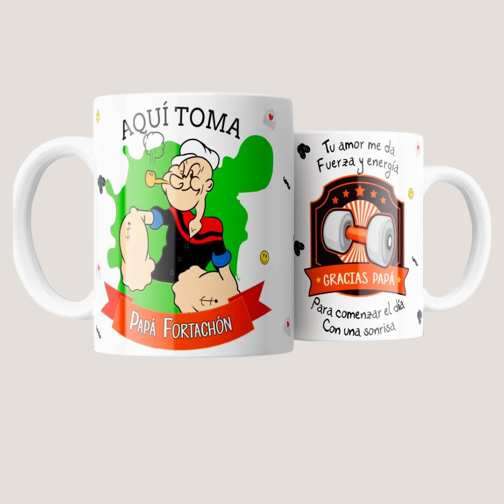 Taza Papá Fortachón con diseño divertido y mensaje especial. Regalo perfecto para el Día del Padre, cumpleaños o sorprender a papá con humor.