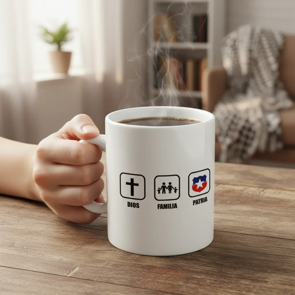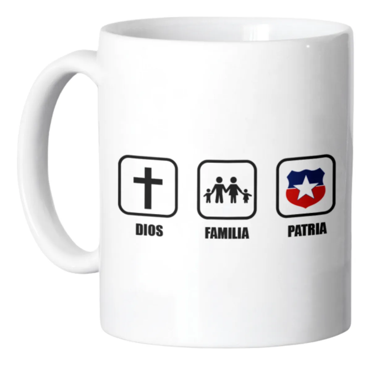 Tazón de cerámica color blanco con diseño gráfico compuesto por tres iconos alineados. El primero representa una cruz con el texto Dios, el segundo una familia con el texto Familia y el tercero un escudo con los colores de la bandera de Chile y el texto Patria, todos visibles en la imagen.