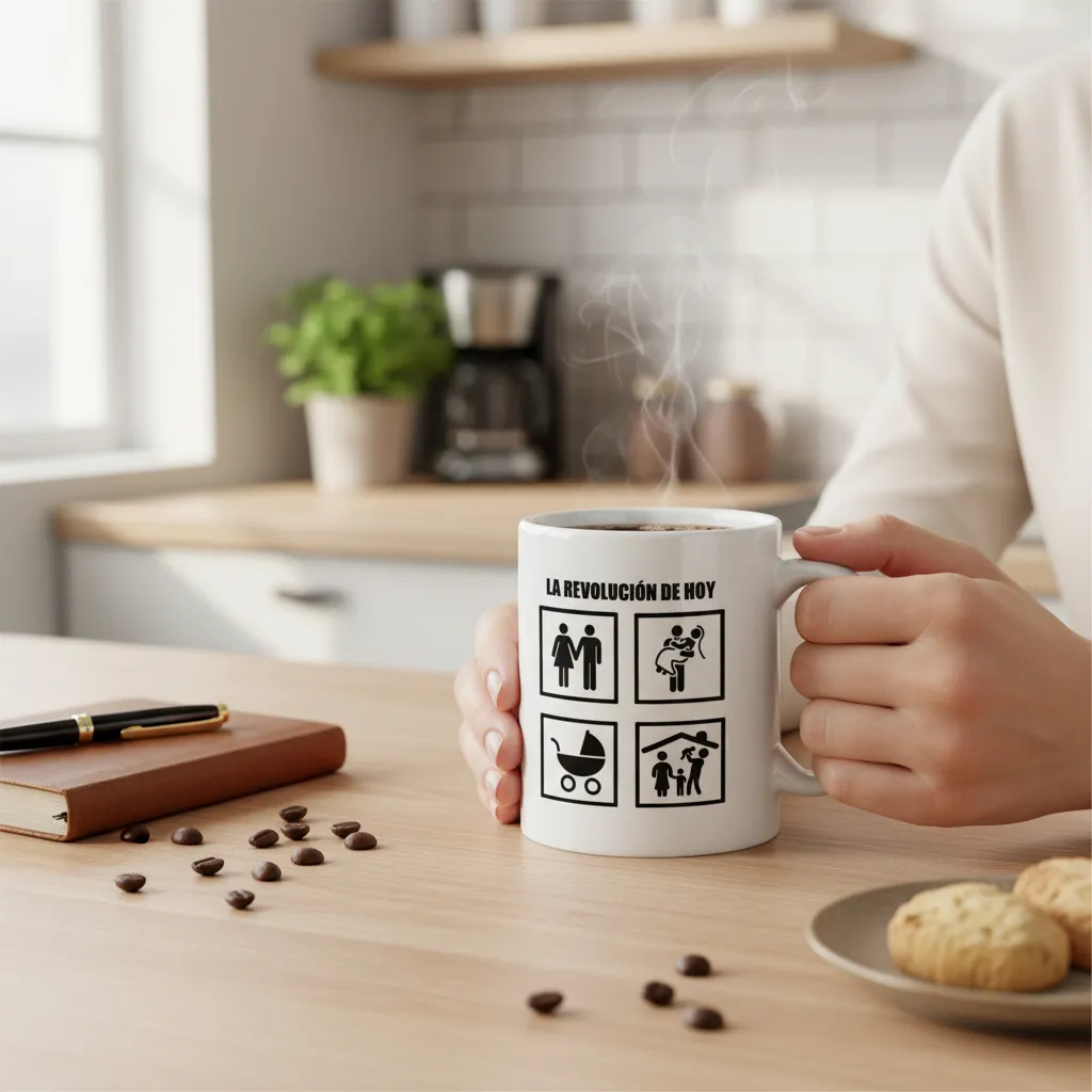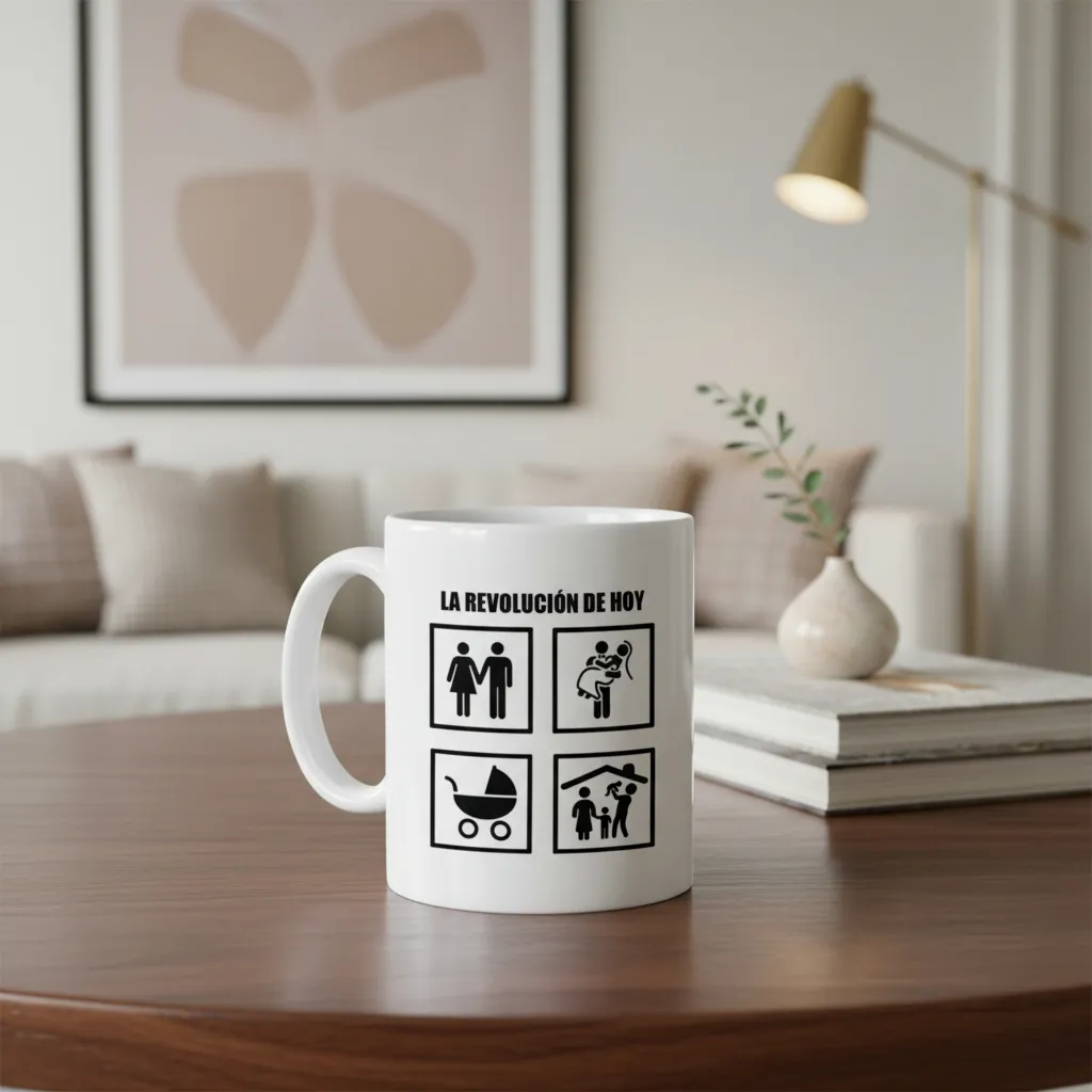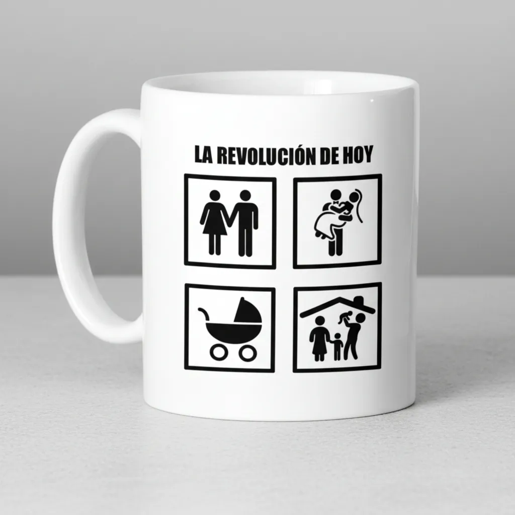 Tazón de cerámica color blanco con diseño gráfico en color negro y el texto La revolucion de hoy en la parte superior. El diseño incluye cuatro iconos representados en recuadros que muestran figuras familiares y escenas cotidianas, tal como se observa en la imagen.