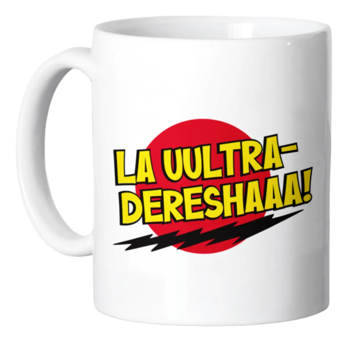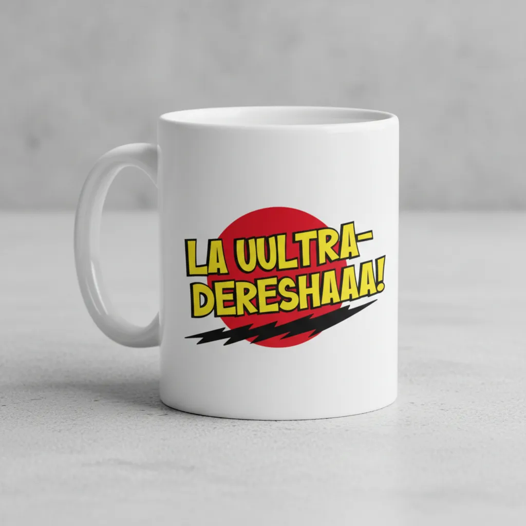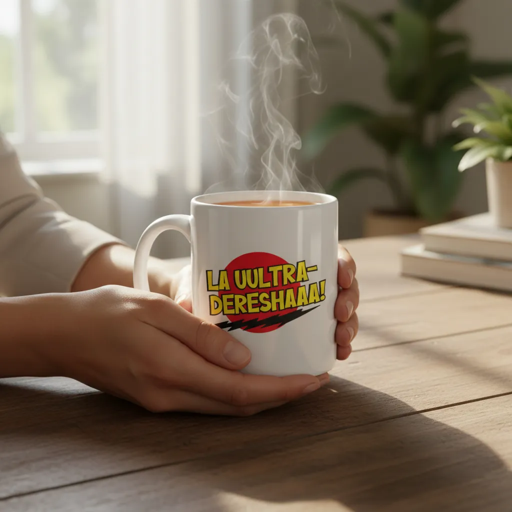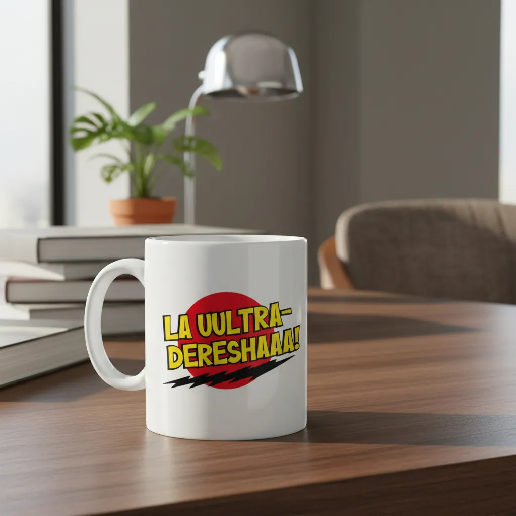 Tazón de cerámica color blanco con diseño gráfico tipográfico en colores amarillo negro y rojo. El texto principal dice La ultra derecha y se presenta sobre un fondo circular rojo con un elemento gráfico en forma de rayo, tal como se observa en la imagen.