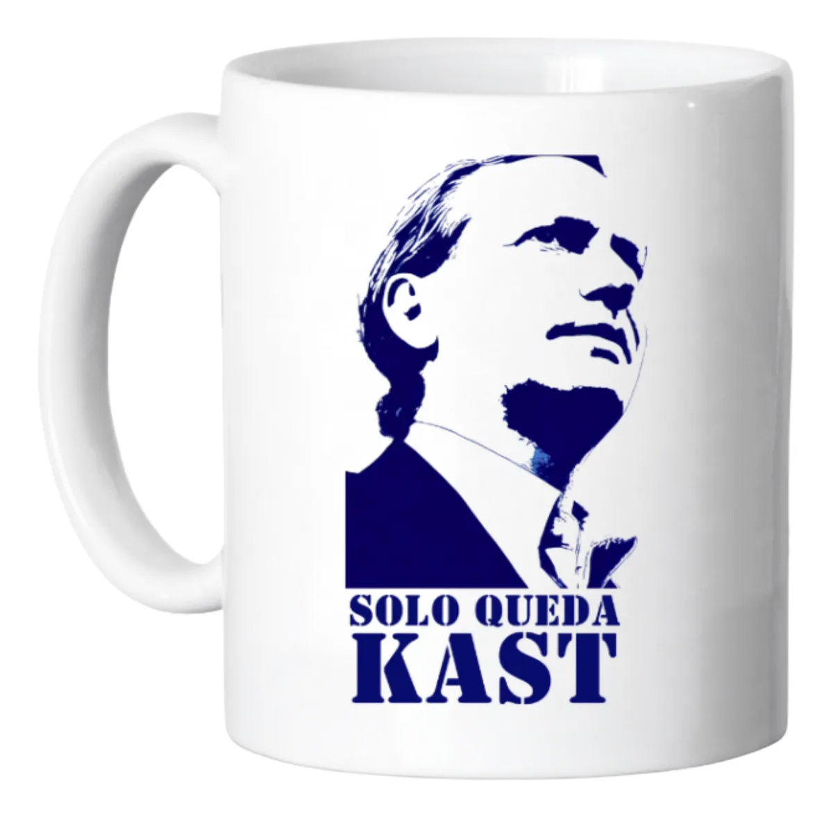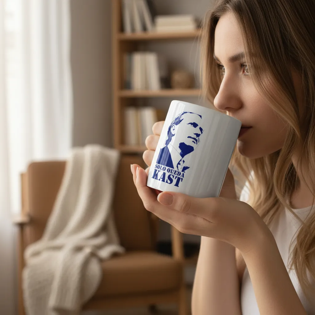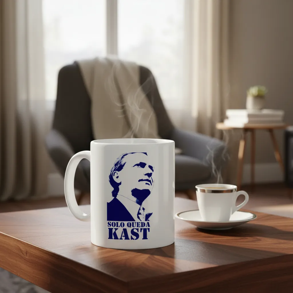 Tazón de cerámica color blanco con diseño gráfico en tono azul que muestra el retrato estilizado de una figura masculina y el texto Solo queda Kast en la parte inferior, tal como se aprecia en la imagen. El diseño es de estilo sobrio y alto contraste.