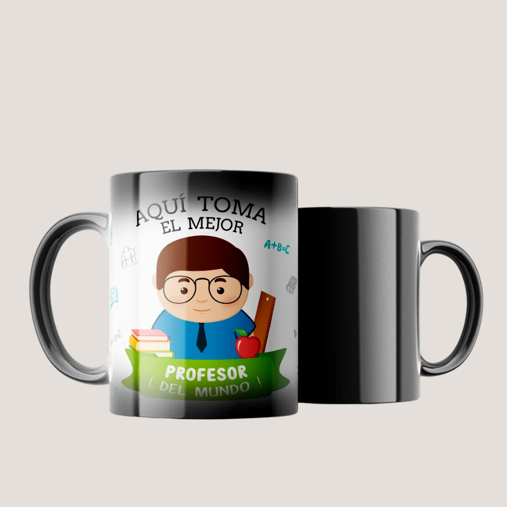 Tazón mágico que cambia de color con agua caliente. Regalo original para el Día del Profesor con diseño “Aquí toma el mejor profesor del mundo”.